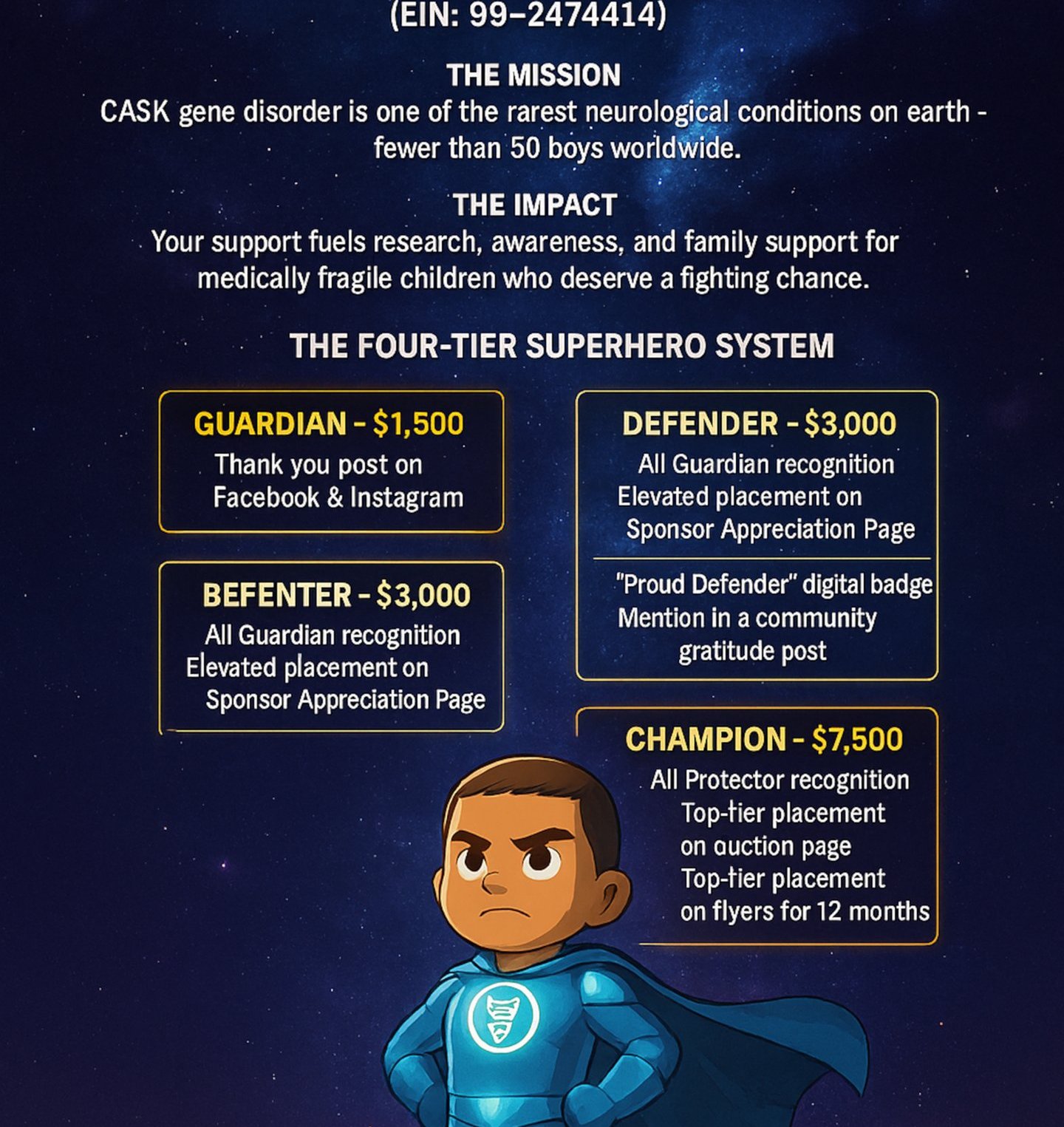Directly to CASK Warriors Foundation Inc with our mission to help bridge the gap that exists from diagnosis of CASK Gene Disorder in boys to funding research for a cure and treatment.